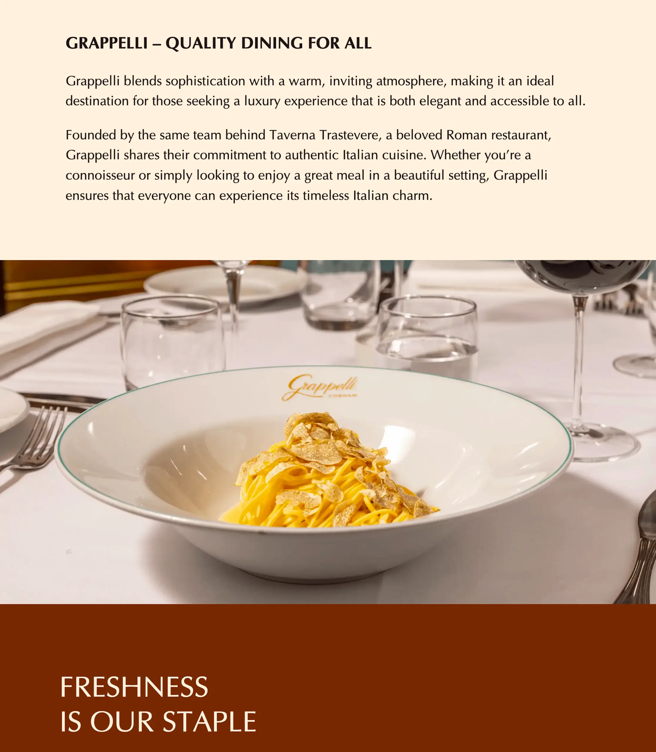 Pringo Group ha creato il sito di Grappelli Cobham, un ristorante italiano nel Surrey. Design elegante, colori raffinati e testi su misura raccontano un locale accogliente, specializzato in pesce e pasta fresca, punto di riferimento per il quartiere.
